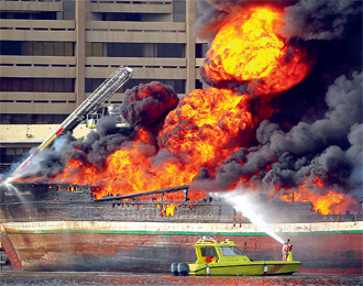 Officials of the Dubai Municipality said the dhow should not have been allowed to do repair works at the wharfage area. Noting that the owners violated safety rules again, a senior official said the municipality, which had exempted them from fines and creek cleaning fees last time, will take action if the creek is polluted due to the latest fire.