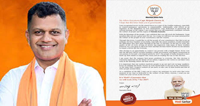 Mangaluru: BJP candidate in Dakshina Kannada Capt Brijesh Chowta has received a letter from Prime Minister Narendra Modi wishing him victory in the election.