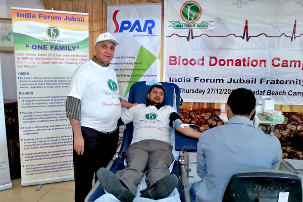 Jubail, December 29: India Forum Jubail (IFJ), a community service organisation based in Kingdom of Saudi Arabia conducted its first ever blood donation camp on Thursday, December 27, from 9 a.m. to 3:30 p.m. at Sadaf beach camp in coordination with Jubail General Hospital.