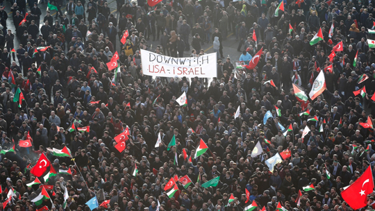 In Turkey's Istanbul, thousands of demonstrators took to the streets again, transforming the city's Yenikapi Square into a sea of Turkish and Palestinian flags.