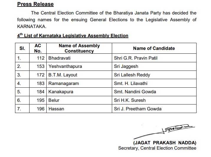 The Bharatiya Janata Party on Monday, April 23 announced its fourth list of seven candidates for the upcoming Karnataka Assembly elections scheduled to be held on May 12.