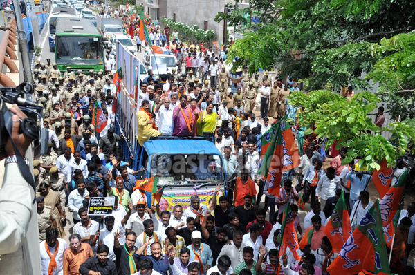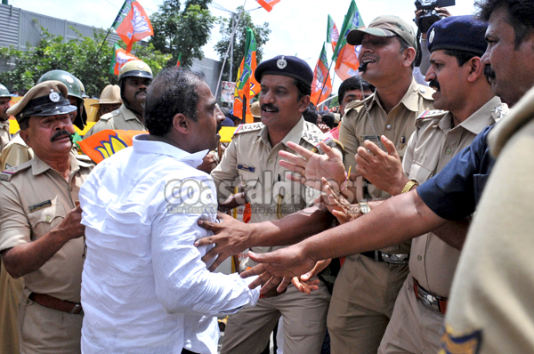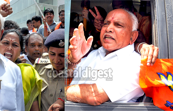 The police took Yeddyurappa and other BJP leaders, including Leader of the Opposition in the Legislative Assembly Jagadish Shettar, Leader of the Opposition in the Legislative Council K S Eshwarappa, former ministers R Ashoka, Govind Karjol and Shobha Karandlaje into preventive custody when they were marching to lay a siege to the Vidhana Soudha. The leaders were taken away from Race Course Road by a BMTC bus and released later.