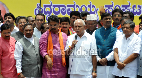 The protesters raised slogans against Chief Minister Siddaramaiah and his government for indulging in “corruption.” Yeddyurappa said the BJP would conduct a week-long protest in all the Assembly constituencies, demanding the resignation of corrupt Congress ministers.