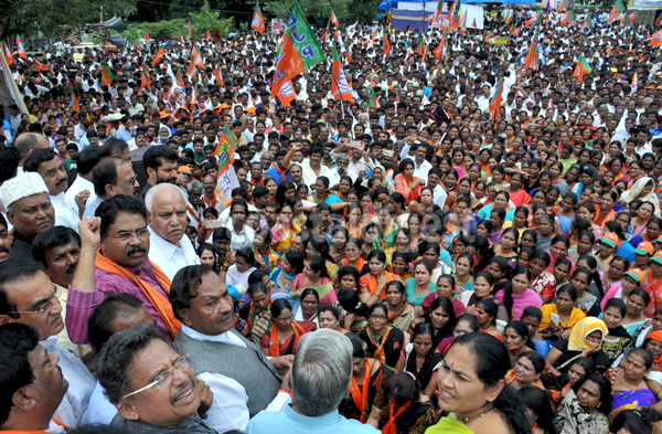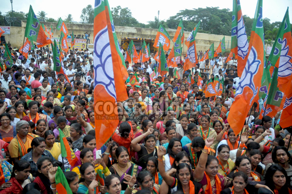 Bengaluru, Aug 19: Thousands of BJP workers led by party state president B S Yeddyurappa on Friday staged a demonstration, demanding resignation of Energy Minister D K Shivakumar and Small Scale Industries Minister Ramesh L Jarkiholi in the wake of searches and seizures by the Income Tax Department sleuths on their houses.