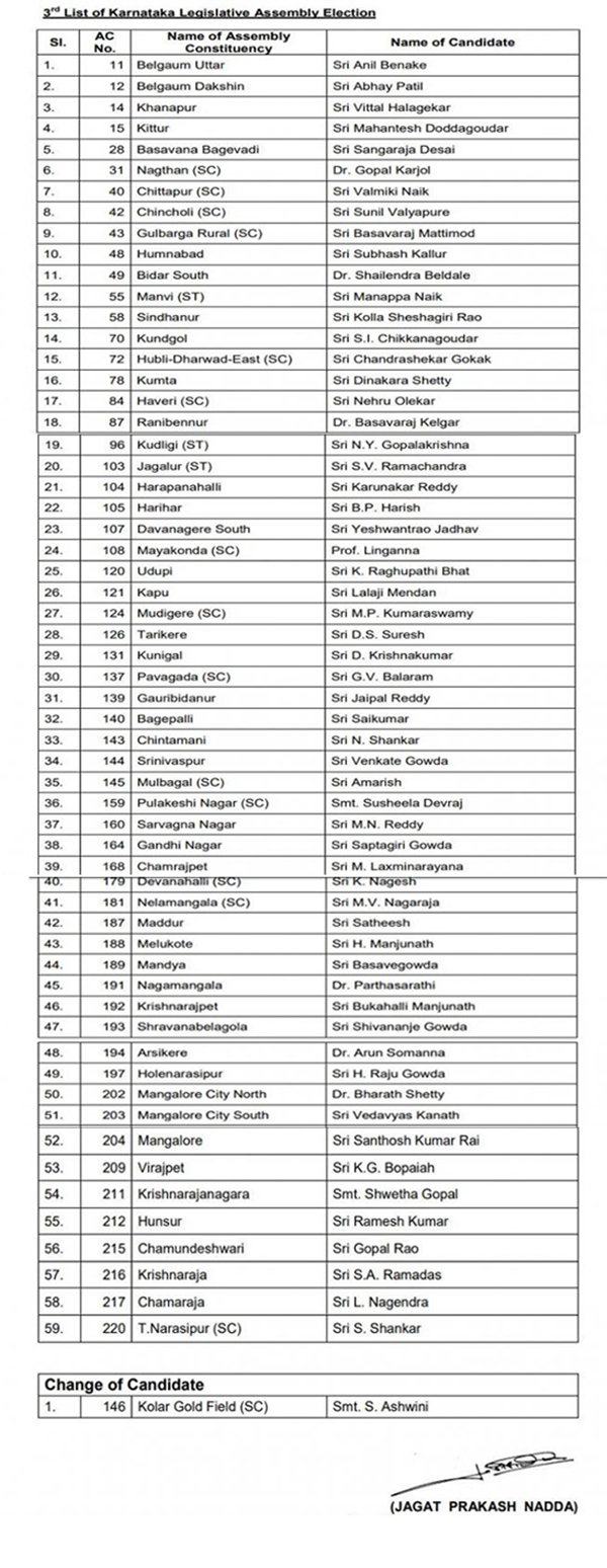 The Bharatiya Janata party (BJP) on Friday released its third list of 59 candidates for the upcoming Karnataka Assembly elections.