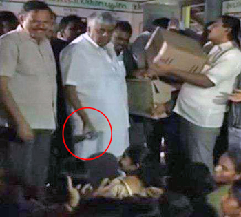 His brother, the state Public Words Department Minister, was seen taking biscuit packets from officials and lobbing them at flood-hit men, women and children sitting on the floor in front of him.