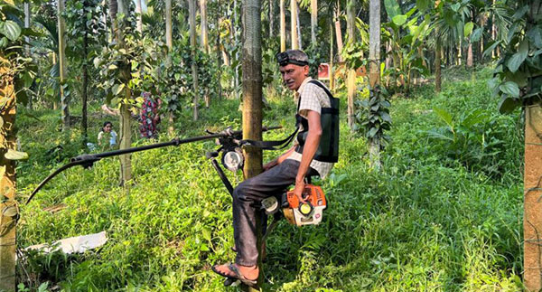 On a recent morning, Bhat strapped on a seat-belt, which is hooked to the handle of this contraption. He then revved up the scooter, zooming up an areca nut tree. High above the ground, Bhat quickly inspected the crop before descending at top speed.