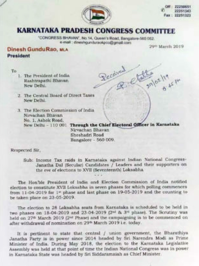 Bengaluru, Mar 30: Karnataka Congress chief Dinesh Gundu Rao on Saturday wrote a letter to President Ram Nath Kovind seeking his intervention against the ongoing Income Tax raids against the Congress and JD (S) leaders, terming it as a political vendetta by the BJP against its rivals at the time of elections.