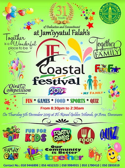 Dammam: The Dammam unit of Jam’iyyatul Falah has planned to organize “JF MEGA COASTAL FESTIVAL 2019”, a family get-gogether for a noble cause on 5th December 2019 (Thursday) at AL-RIMAL GOLDEN ISTHIRAH at 91 Area in Dammam.