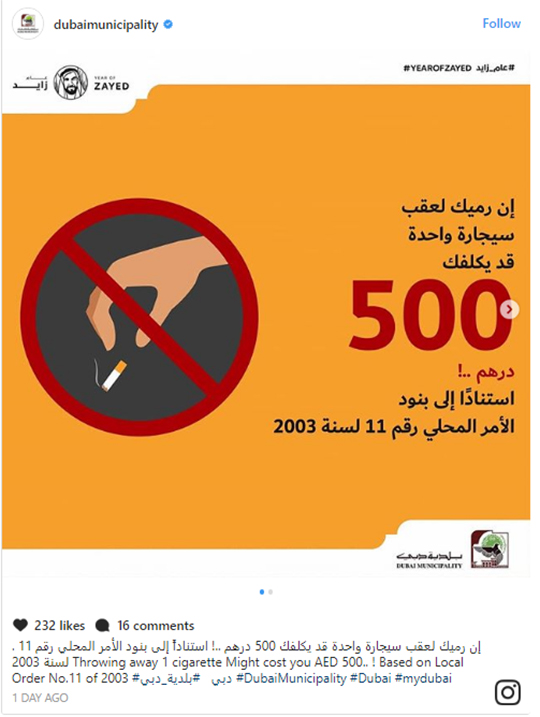 Littering cigarette butts can now invite a fine of Dh 500 in Dubai. According to the Dubai Municipality, based on Local Order No.11 of 2003, fine shall be imposed on the person throwing cigarette butts on Dubai roads, streets, parks or other locations.