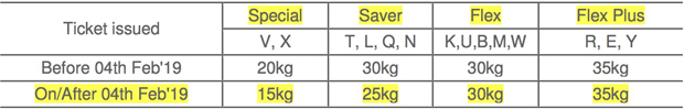 From February 4, Special and Saver ticket holders will have an available baggage allowance of 15kg and 25kg respectively. Originally, these tickets allowed for 20kg and 30kg of baggage. Flex and Flex Plus allowances will remain the same.