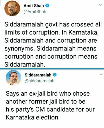 On Friday morning, Siddaramaiah tweeted: “Says an ex-jailbird, who chose another former jailbird to be his party’s CM candidate for our Karnataka election. Can he present facts about the so-called corruption charges against me or my govt.? Just telling lies won’t help. People will not believe his #jumlas.”