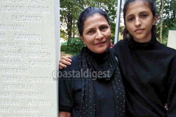 Gauri Lankesh’s sister Kavitha Lankesh and niece Esha stand next to a pillar on which slain journalist’s name has been engraved