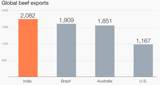 According to the data, India exported 2.4 million tonnes of beef and veal in FY2015, compared to 2 million tonnes by Brazil and 1.5 million by Australia.