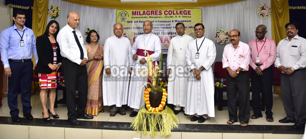 The conference was inaugurated in a symbolic way by the President Most Rev. Dr Aloysius Paul D’Souza, Bishop of Mangaluru, as per the traditional method of Tulunadu. Chief guest Rev. Fr Anthony Serrao, Secretary, Catholic Board of Education, Guest of Honour Prof. Balakrishna Pai, President, MUCTA & Rev. Fr Valerian D’Souza, Correspondent of Milagres Educational Institutions, key note speaker Dr Aloysius H Sequeira, Dean, National Institute of Technology, Karnataka (NITK), Resource person Mrs Florine Lobo, Mr Cassin Rodrigues, Vice Principal & Conference Convenor were present on the dais.