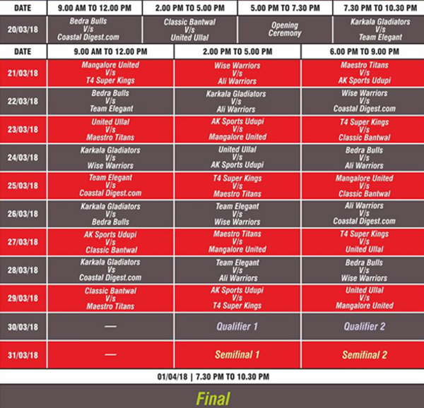 Second match will be held at 2.00 p.m between the teams Classic Bantwala and United Ullala.  After the opening ceremony Karkala Gladiators and Team Elegant will be playing  the third match under the floodlights.