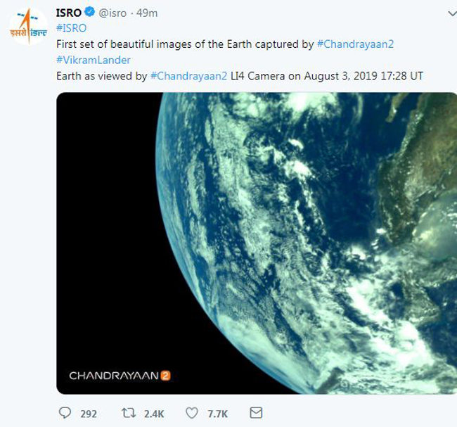 New Delhi, Aug 4: Indian Space Research Organisation (ISRO) on Sunday shared the first set of images of the Earth as viewed by Chandrayaan-2.