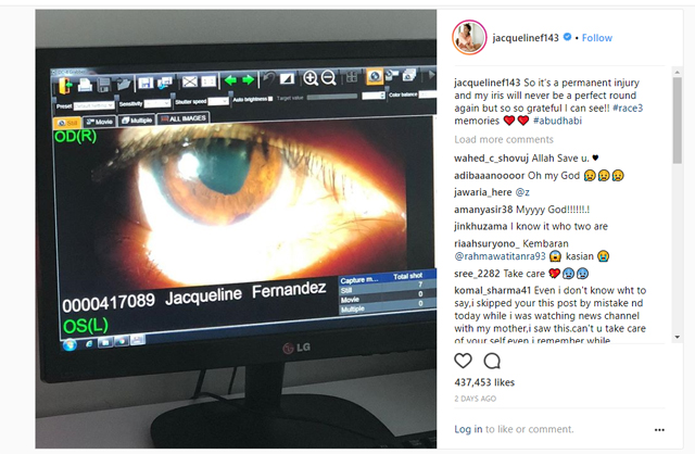 The 'Race 3' actress took it to her Instagram and shared a photo of her eye with a caption "So it’s a permanent injury and my iris will never be a perfect round again but so so grateful I can see!! #race3 memories #abudhabi"