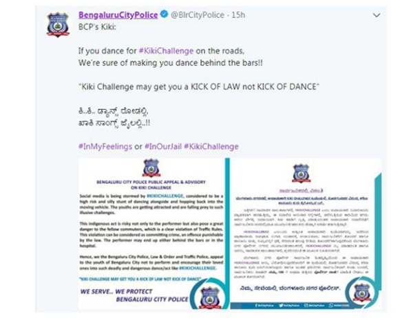 Bengaluru, Aug 2: The Bengaluru Police, just like other state authorities, has issued a warning against the viral 'In My Feelings' challenge - also known as the 'Kiki' challenge - and urged people not to do it.