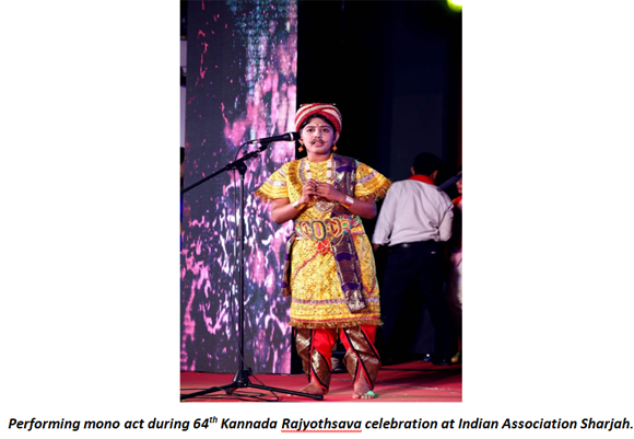 •  He performed a mono act in Kannada language enacting the role of the historical figure Madhakari Nayaka of Chitradurga at the 17th Annual Day Celebration of Sharjah Karnataka Sangha atIndian Association, Sharjah(2019).
