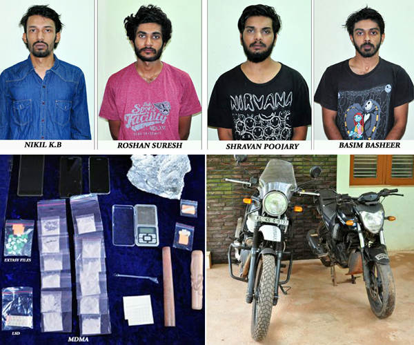 Police sources said that Nikhil is an eight semester student who had failed in two subjects. Nikhil is accused of supplying drugs to customers in the city. Shravan had successfully completed his engineering course from a college in the city in the year 2015. Meanwhile Roshan Suresh and Basim Basheer are third year students studying in a dental college in the city.