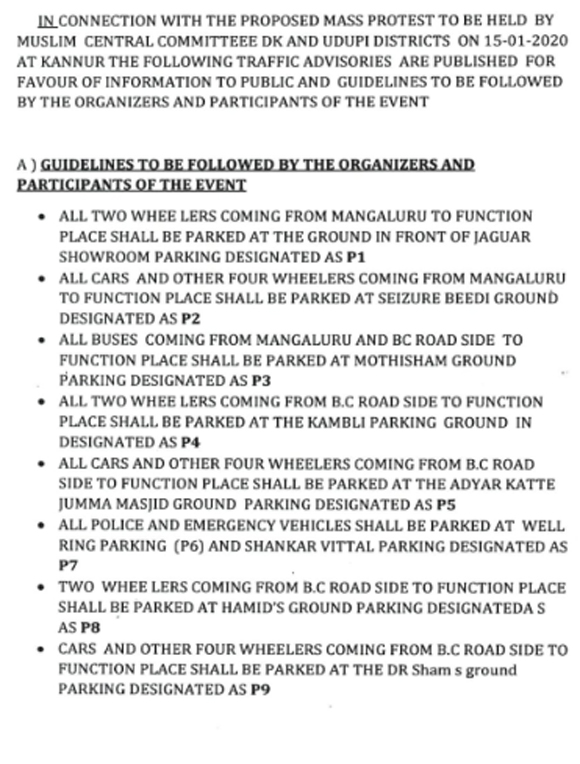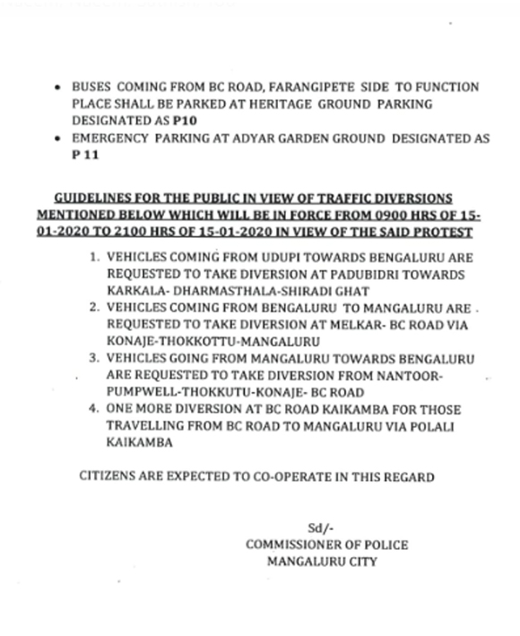 Mangaluru, Jan 14: Mangaluru city police commissionerate his notified traffic diversions on NH 73 in view of massive protest at Adyra Kannur in the city against CAA, NPR and NRC on January 15. It also has issued guidelines for the public, protesters and organisers of the protest.