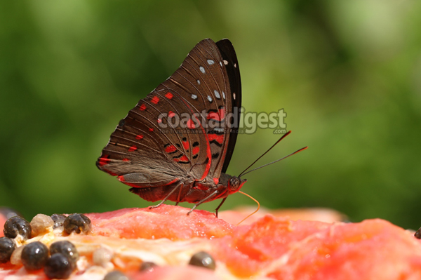 At this ancestral property spreading over 7.35 acres of semi-forest land, interesting species like, Autumn Leaf (Doleschallia bisaltide), Clipper (Parthenos sylvia),  Tawny Rajah (Charaxes psaphon), Black Rajah (Charaxes solon), Paris Peacock (Papilio paris), Redspot Duke (Dophla evelina), Blue Oakleaf(Kallima horsfieldii), Colour Sergeant (Athyma inara), which are otherwise uncommon, frequent at this open-private conservatory.