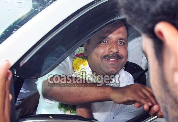 Mangaluru Jun 9: U T Khader, the minister for urban development and housing, today received a rousing reception after landing at Mangaluru International Airport.