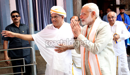 Mr. Modi landed at the Mangaluru airport from New Delhi and flew to Dharmasthala in a helicopter. The Prime Minister offered prayers at the Manjunatheshwara Temple in Dharmasthala.