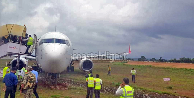 AAI in an official statement about the incident said, the Boeing737-800 carried out missed approach at 5.32pm and thereafter in second attempt landed at Mangalore on runway 24 at 5.42pm. The aircraft while turning on taxiway entered unpaved portion of the strip apparently due to high speed as per observation of ATC. There appears to be no damage to the aircraft and engineers are trying to tow the aircraft to apron for further inspection.
