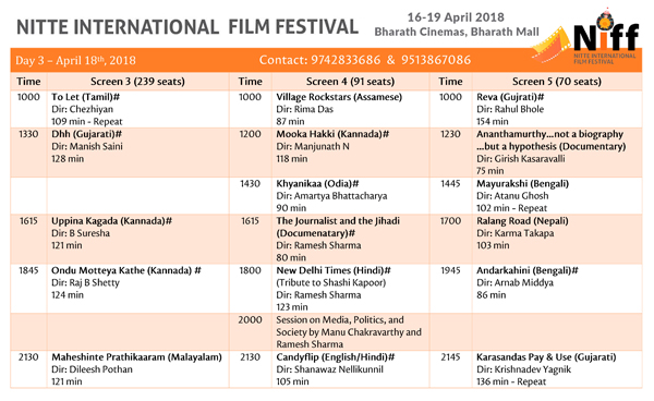 The festival will kick off on April 16 at 10:00 a.m. with the inauguration by renowned film-maker and theatre person M. Sadananda Suvarna. NIFF will open with the National Film Award winning Hindi film Mukti Bhawan (2016, Special Jury Award). The line-up for this year includes several other National Film Award winners, such as Village Rockstars (Best Film, Best Editing), Thondimuthalum Driksakshiyum (Best Malayalam film, Best Original Screenplay), Mayurakshi (Best Bengali Film), Dhh (Best Gujarati Film) and To Let (Best Tamil Film).