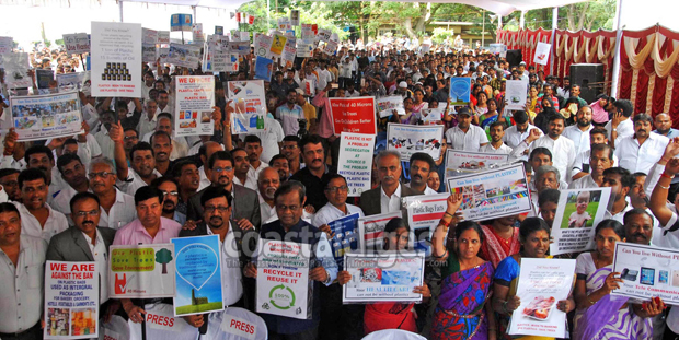 Bengaluru, Sept 1: Demanding the Karnataka government to immediately withdraw the ban on plastic, hundreds of people belonging to plastic sector yesterday staged a protest at Freedom Park here. The protest was organised by the Karnataka State Plastic Association (KSPA) and related associations and industry.