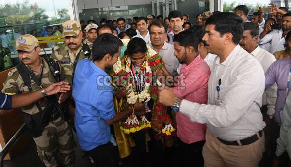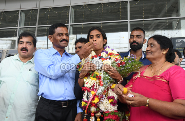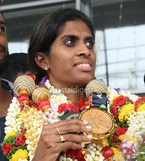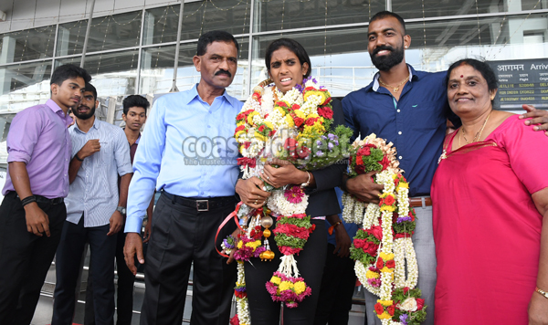 Manglauru, Sept 6: Ace sprinter M R Poovamma, who was part of the gold-medal winning Indian 4x400m relay team in the Asian Games, was given a rousing reception on her arrival at Mangaluru International Airport on Thursday.
