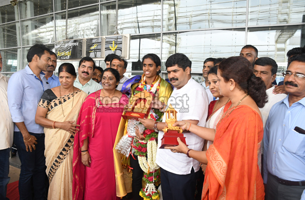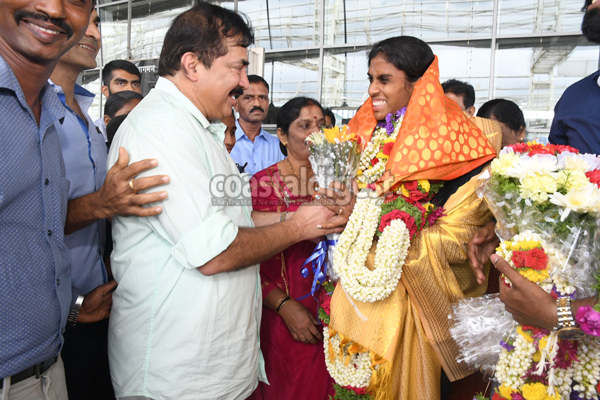 The Mangaluru City South MLA, D Vedavyas Kamath, was among those greeting the athlete, who is a native of Mangaluru, and felicitating her.