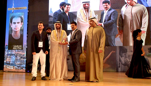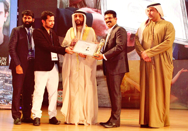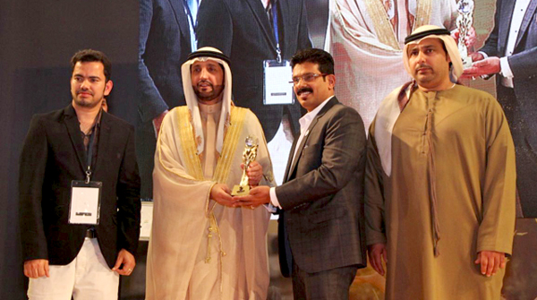 Shakeel Hassan H, founder-president of HMC United and Suhail Al Zarooni presented Praveen Shetty the award trophy and certificate in a glittering ceremony at Sheikh Rashid Auditorium, The Indian High School, Dubai.