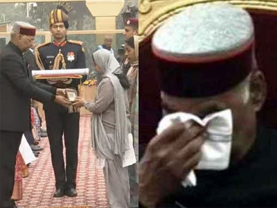 After presenting the award to Corporal Nirala's wife Sushmanand and his mother Malti Devi at the Republic Day Parade, Kovind was seen wiping his face and eyes with his handkerchief.