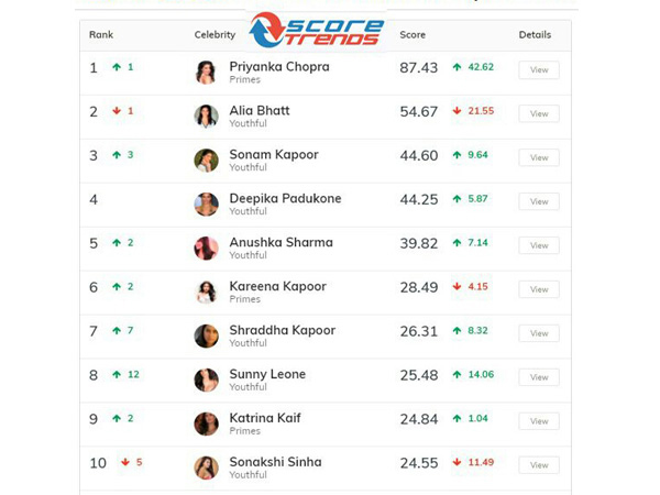 Delhi, Apr 28: Bollywood actress Priyanka Chopra has emerged as the numero uno on the Score Trends India chart - yet another achievement for the artist.