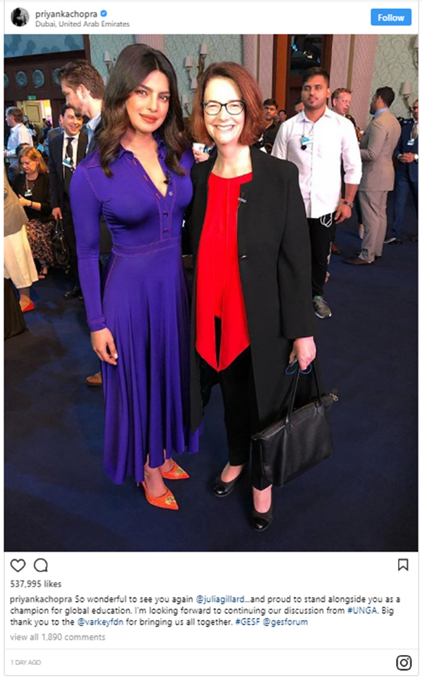 Chopra wrote, "So wonderful to see you again @juliagillard...and proud to stand alongside you as a champion for global education. I'm looking forward to continuing our discussion from #UNGA. Big thank you to the @varkeyfdn for brining us all together. #GESF @gesforum".