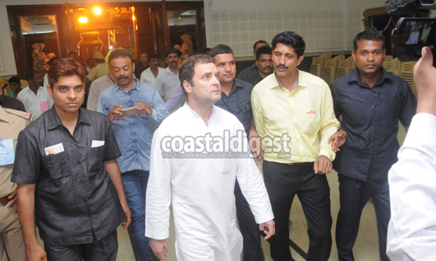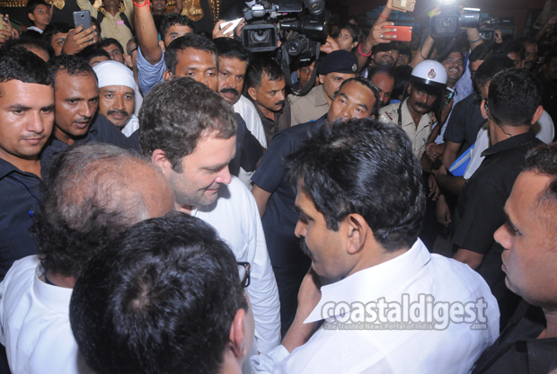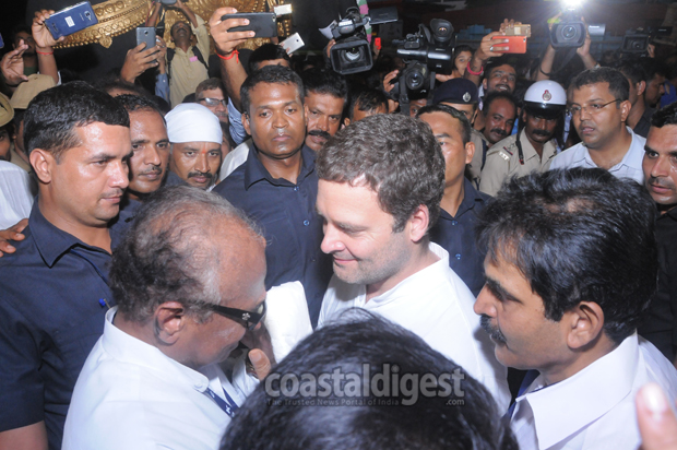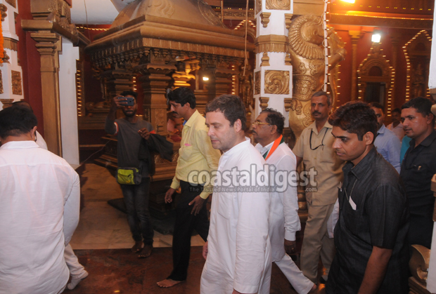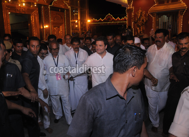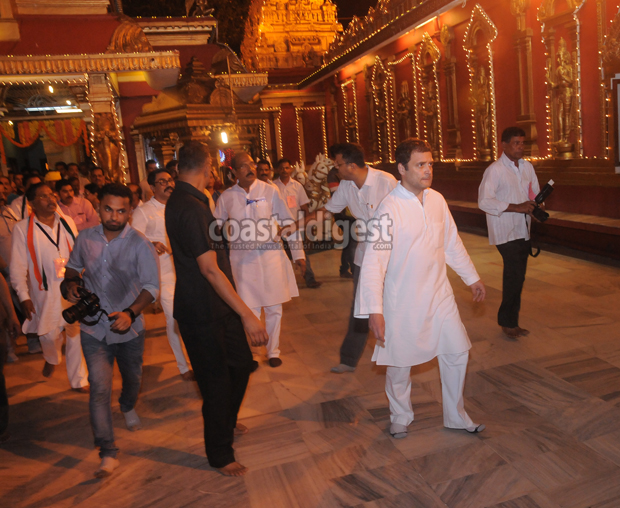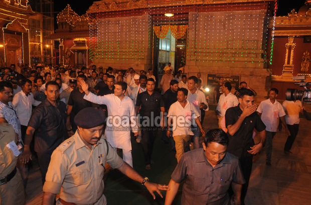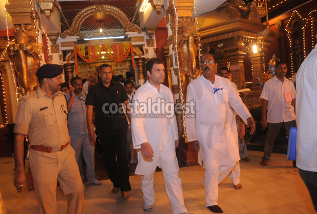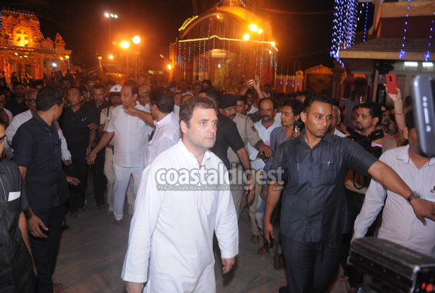 After his public rally at Nehru Maidan in the city, he visited the Church of Our Lady of Rosary in Pandeshwar and offered prayers. Bishop Aloysius Paul DSouza, Msgr Denis Moras Prabhu , Sr Rose Celine BS, Mr MP Noronha, Fr J B Crasta and others honoured Rahul on the occasion.