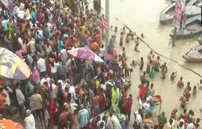 Varanasi, Aug 2: Large crowds of Hindus were seen in Varanasi as they took a dip in the Ganga river and offered prayers at Kashi Vishwanath Temple on Monday despite warnings from the authorities to adhere to Covid-19 guidelines.