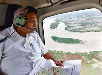 Belagavi, Aug 5: Karnataka Chief Minister B S Yediyurappa made an aerial survey of flood affected districts in North Karnataka, even as the situation continued to be grim and river Krishna is in spate following unabated heavy discharge from Reservoirs in neighbouring Maharashtra State.