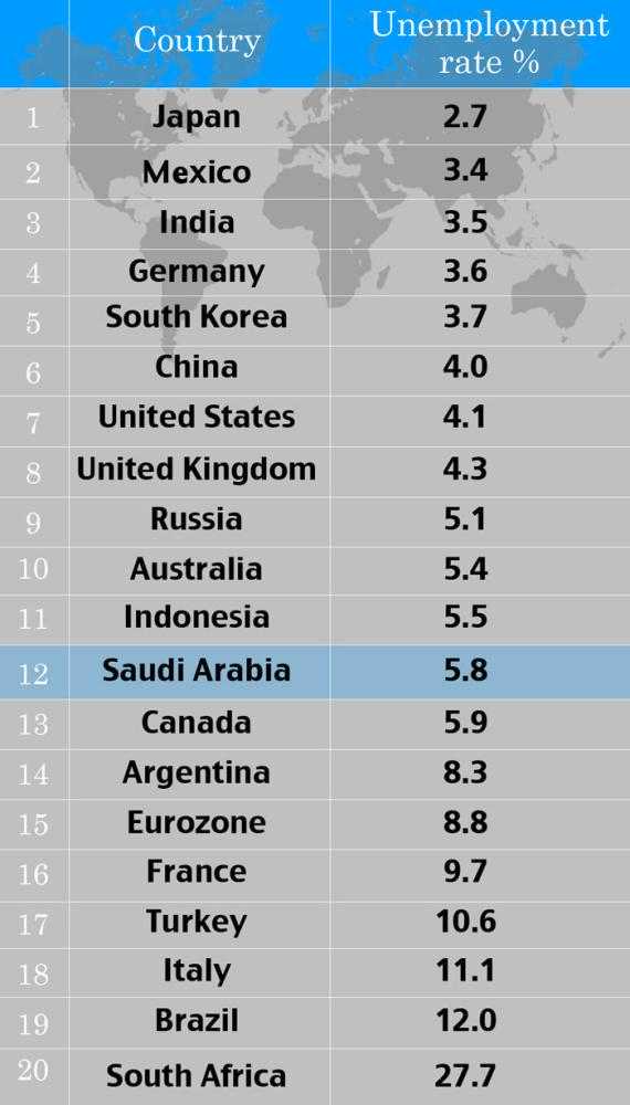 Saudi Arabia stands 12th among G20 nations in terms of the average fall in the rate of unemployment during the third quarter.