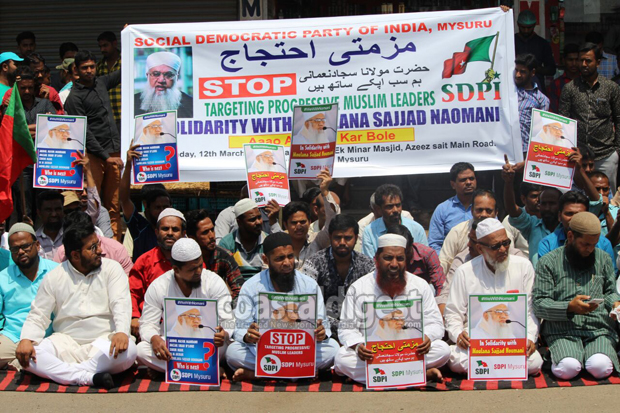 Mysuru: Activists of Social Democratic Party of India on Monday, March 12, staged a demonstration in front of Fountain Circle in the city condemning the alleged witch-hunt and attacks on Muslim religious scholars.