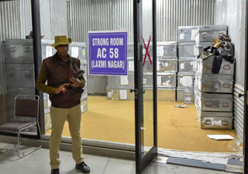 Feb 9: The Electronic Voting Machines (EVMs) used in Delhi Assembly polls are kept under tight security, in the 'Strong Room' located at Atal Adarsh Bengali Balika Vidyalaya in Gol Market.