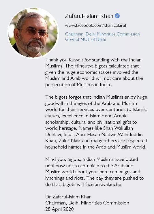 Khan on April 28 had posted controversial comments on his Facebook page. "Mind you, bigots, Indian Muslims have opted until now not to complain to the Arab and Muslim world about your hate campaigns and lynchings and riots. The day they are pushed to do that, bigots will face an avalanche," Khan had written on Facebook.