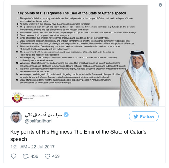 Qatar's Emir Sheikh Tamim: "People are amazed to see Qatari people maintaining high level of morale despite the unprecedented smearing campaign." http://aje.io/wwhlw