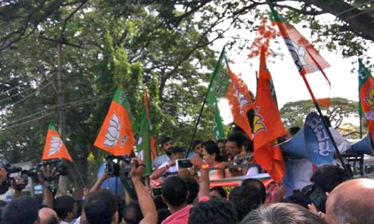 The agitating BJP workers said that the state government is imposing restrictions on celebrating Hindu religious functions. The Congress government has hurt the sentiments of the Hindus by not allowing the celebrations of Hanuma Jayanti, they alleged. The protesters expressed their anguish by raising slogans against Chief Minister Siddaramaiah.