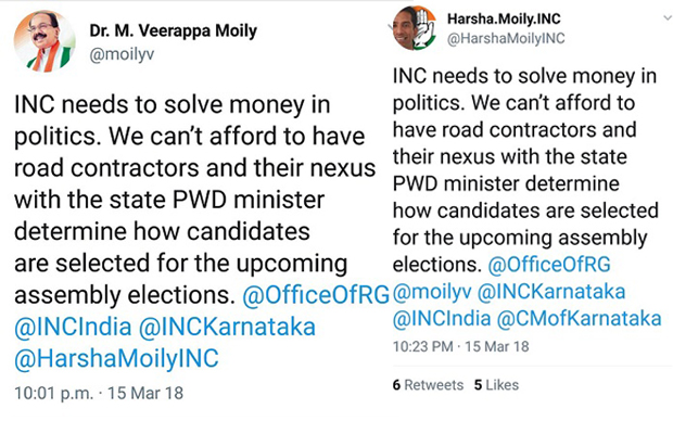 Moily had also tagged AICC President Rahul Gandhi in his tweet. Within minutes Moily’s son Harsha Moily copied the entire tweet and pasted on his unverified twitter account instead of re-tweeting it.