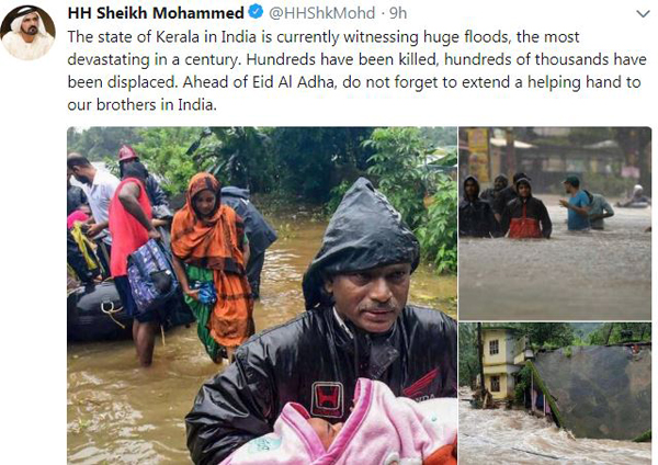 Describing the situation in Kerala as "the most devastating in a century," the UAE President added, "The state of Kerala in India is currently witnessing huge floods, the most devastating in a century. Hundreds have been killed, hundreds of thousands have been displaced. Ahead of Eid Al Adha, do not forget to extend a helping hand to our brothers in India."