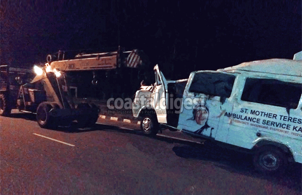 The tragedy occurred when the ambulance, belonging to St Mother Teresa Hospital, was carrying Ullal Talekar, who was suffering from heart ailment, from Karwar to A J Hospital in Mangaluru.